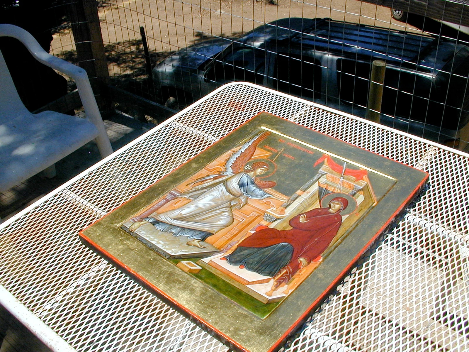 The technique works best if the weather is dry and sunny. It is possible to do the process on a wet, rainy day, but it is much more difficult, not to mention slower. During the process, the icon should sit in sunlight, either in a window, or outside, if it is warm. If the icon is sitting outside, you will want to watch over it, and keep insects from landing on it. Some insects will eat the egg in the paint. The icon should also be shielded from birds flying overhead. If the weather is bad, an ultra-violet heat lamp (or several, for a large icon) may be used.