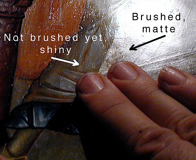 If the icon is not brushed in this way, it will remain shiny and sticky. A good olifa surface is slightly glossy, but not altogether shiny. It should not look "candy-coated." It should not be sticky.